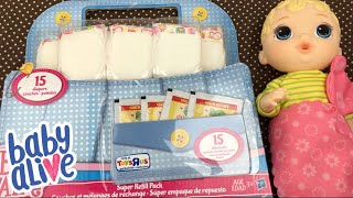 Use baby alive reusable doll food with our super snacks line of dolls only. Baby alive doll food and diapers super refill pack baby alive refill pack make sure youve always got food juice and a fresh doll diaper on hand when you and your baby alive doll sold separately need it. Today i open up this baby alive super refill pack.