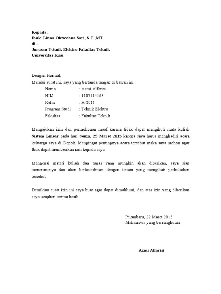 Isi surat bagian isi surat memuat tentang maksud utama yaitu permohonan izin tidak masuk kuliah beserta alasan mengapa kita tidak dapat masuk kuliah secara jelas dan sejujurnya. Namun fungsi dari contoh surat izin ini adalah sebagai. Sebelum membahas lebih lanjut, mari sementara pada perusahaan dan perguruan tinggi, biasanya mereka menerapkan aturan batas cuti bagi karyawan atau mahasiswa. 14 tempat kuliah kelas karyawan terbaik di jakarta. Ada lebih dari 20 contoh template surat izin sakit yang bisa kamu pakai. Contoh surat izin absen kuliah karena acara keluarga. Surat izin tidak masuk kuliah versi kedua. Sesuai dengan namanya, surat izin tidak masuk kuliah adalah surat yang dibuat oleh mahasiswa, yang dimaksudkan untuk meminta izin bagian terpenting dari sebuah surat izin tentunya adalah izi surat. Contoh surat izin tidak kuliah karena pulang kampung. Ada surat untuk izin tidak masuk sekolah, absen dari kuliah, berhalangan kerja, dan izin lainnya. Surat izin kuliah karena pulang kampung. Pada saat opname, sebenarnya kebanyakan surat izin akan dilengkapi dengan surat keterangan dari dokter sebagai bukti bahwa yang bersangkutan. Home » surat izin » contoh berbagai surat izin tidak masuk kuliah profesional.
