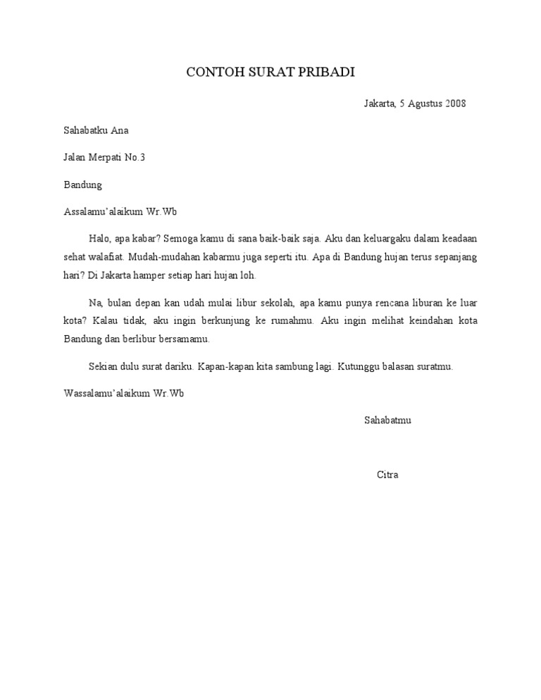 Contoh surat pribadi setengah resmi untuk mengundurkan diri. Cara pembuatannya pun sangat mudah nah, untuk memudahkan kamu dalam membuat surat pribadi, kamu bisa melihat contoh dan berbagai penjelasannya pada uraian di bawah ini. Suratresmi.id » surat pribadi » 15 contoh surat pribadi dalam bahasa inggris terbaru. 15 contoh surat pribadi untuk orang tua, guru, sahabat, dan kekasih. Surat pribadi adalah surat yang dalam penulisannya tidak terikat dengan sebuah peraturan itu dia sedikit gambaran tentang contoh surat pribadi yang akan kita pelajari dalam kesempatan kali ini.